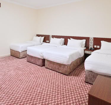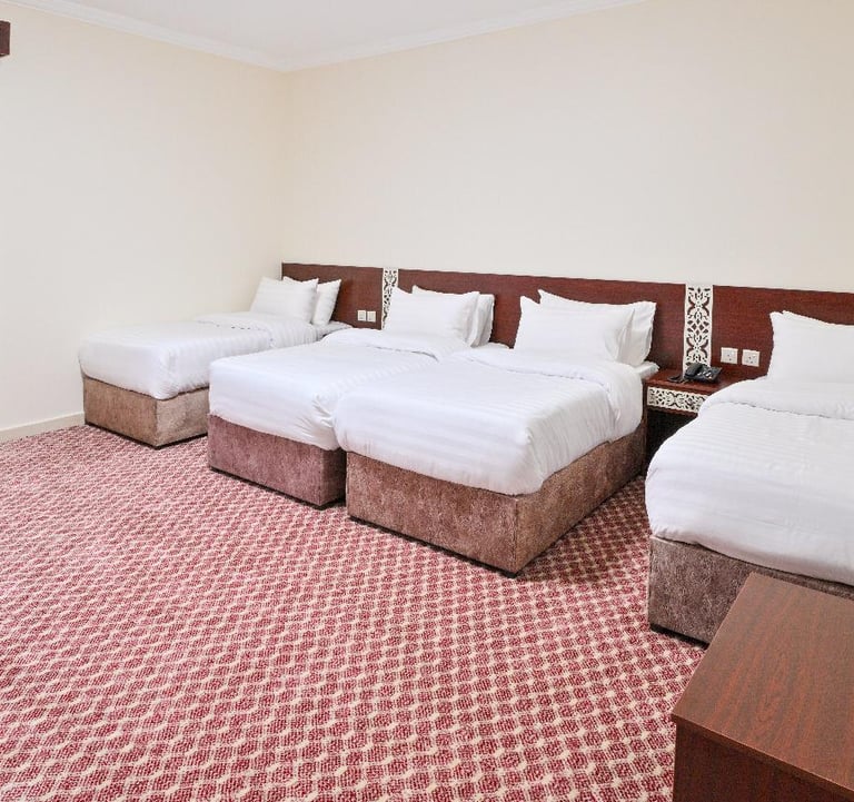 غرفة مصممة لاستيعاب أربعة أشخاص براحة تامة، تحتوي على أربعة أسرّة فردية أو مزيج من الأسرة حسب الطلب.